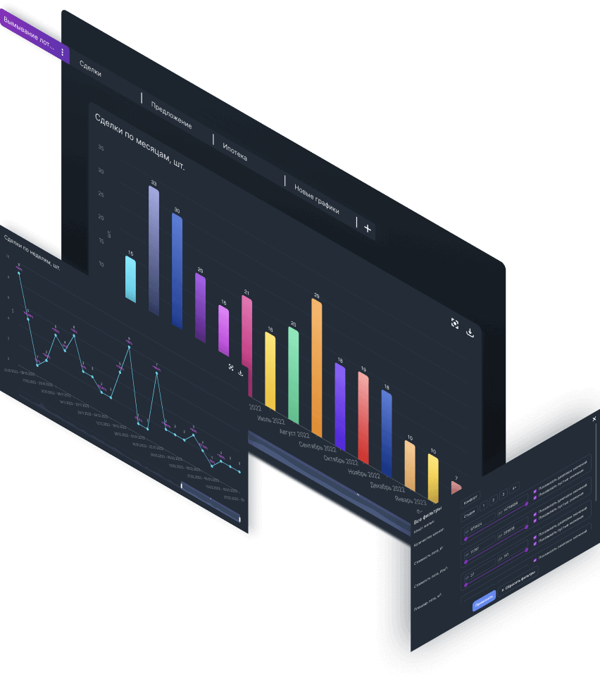 В ежедневном режиме собирает данные с агрегаторов, сайтов девелоперов, федеральных сервисов и ежемесячно обрабатывает выписки Росреестра, обновляет данные из проектных деклараций.